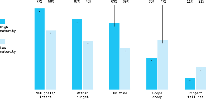 Chart of organisation with high and low maturityThat means a strong project overview can directly improve your odds of delivering on time and within budget.